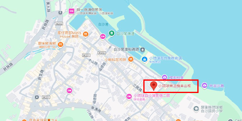 (8) 機車租借位置距白沙港步行約6分鐘路程,下船即可取車非常方便。當日租車須於營業時間結束前返還(營業時間:07:30~16:30)。