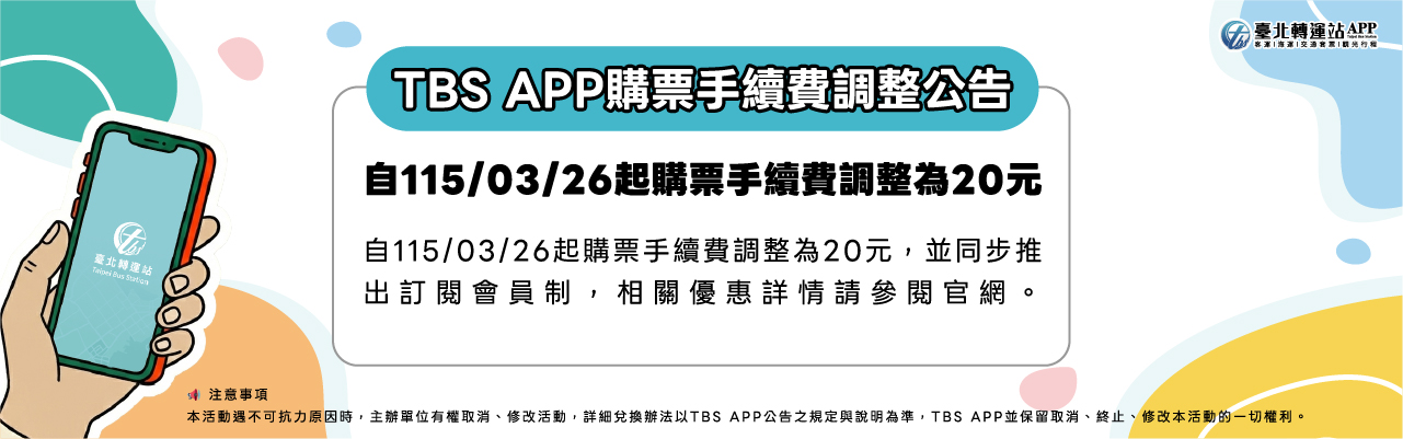 為反應APP營運成本調漲,自 115/03/26(四)起,TBS APP 購票手續費將調整為 20 元,與此同時,我們也將推出全新VIP訂閱會員制,準備帶給大家更多購票優惠與超值回饋,還請大家未來也能持續對 TBS APP 的支持與關注 ,謝謝。
